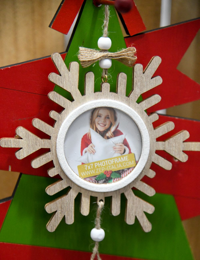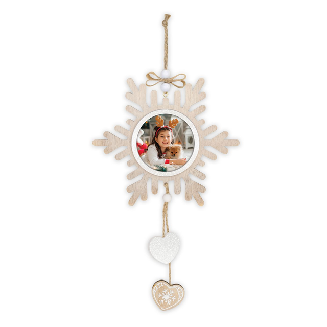 Erling C, decoro natalizio in legno con foto, a forma di fiocco di neve, con decori a rilievo e glitterati, personalizzabile con una foto, da appendere, idea regalo originale, simpatico addobbo natalizio, regalo personalizzato.