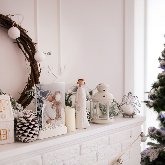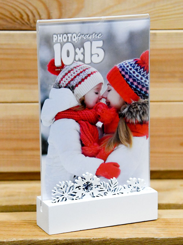 Cornice Dobiacco Vertical in acrilico, finitura trasparente, base in legno colore bianco, con decoro a forma di fiocchi di neve a rilievo, da tavolo, per 2 foto fronte e retro, a tema natalizio, idea regalo originale, addobbo natalizio, regalo personalizzato.