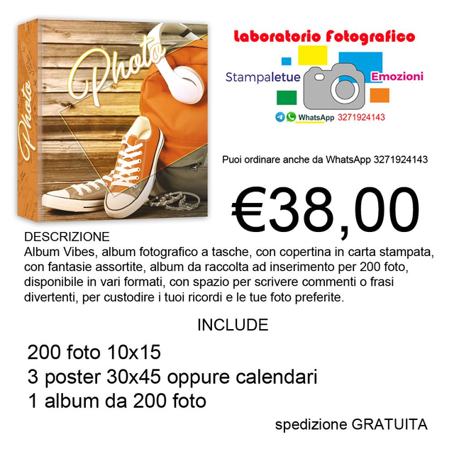 Album Vibes, album fotografico a tasche, con copertina in carta stampata, con fantasie assortite, album da raccolta ad inserimento per 200 foto, disponibile in vari formati, con spazio per scrivere commenti o frasi divertenti, per custodire i tuoi ricordi e le tue foto preferite.