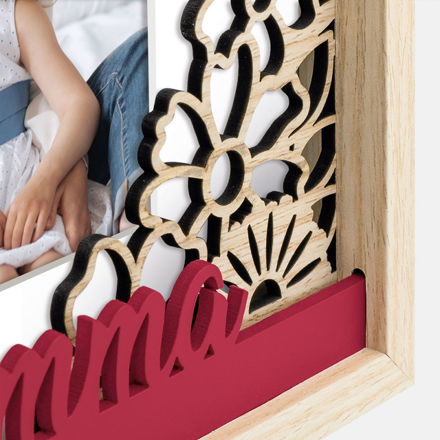 Cornice Chloe IT in legno, colore naturale e bianco, con scritta MAMMA rossa a rilievo e decoro floreale traforato, su vari livelli, da tavolo o da parete, adatta come regalo per la festa della mamma, ideale per celebrare anniversari o compleanni, adatta per casa e ufficio.