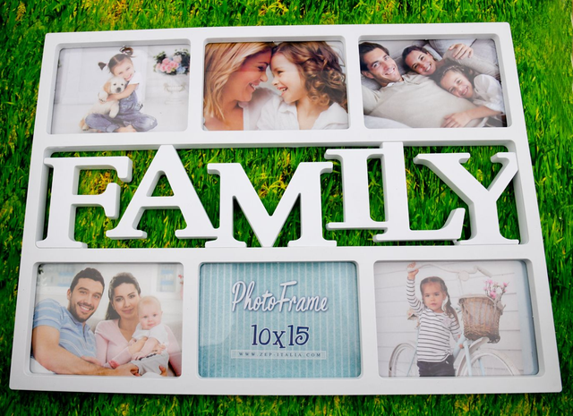 Cornice Family in plastica, colore bianco, multifoto da parete, con decoro traforato, scritta FAMILY, per 6 foto, adatta per casa e ufficio.