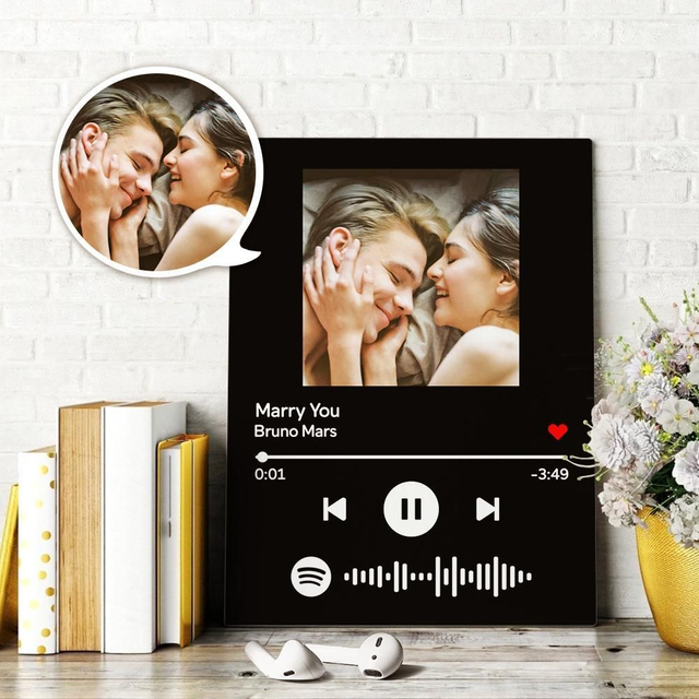 Un regalo che lascia a bocca aperta il destinatario. Quadro con stampa su tela canvas, personalizzato con la vostra foto preferita e la canzone del cuore con codice spotify scansionabile.
